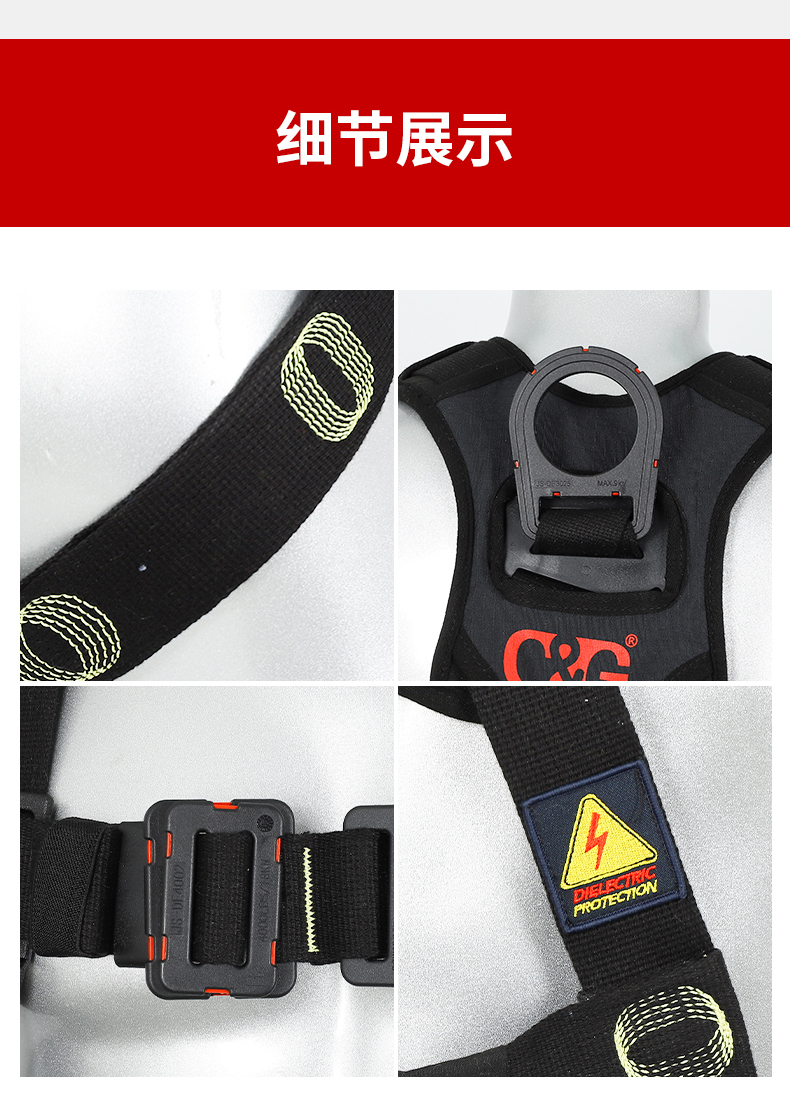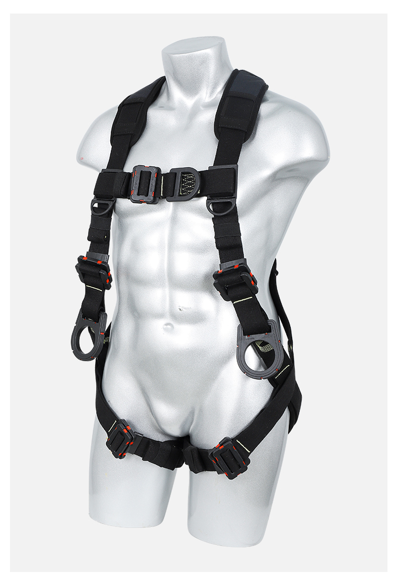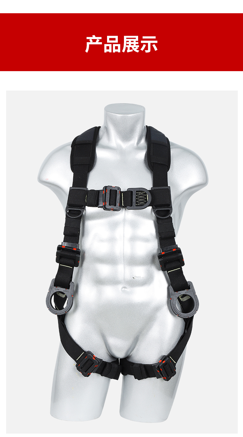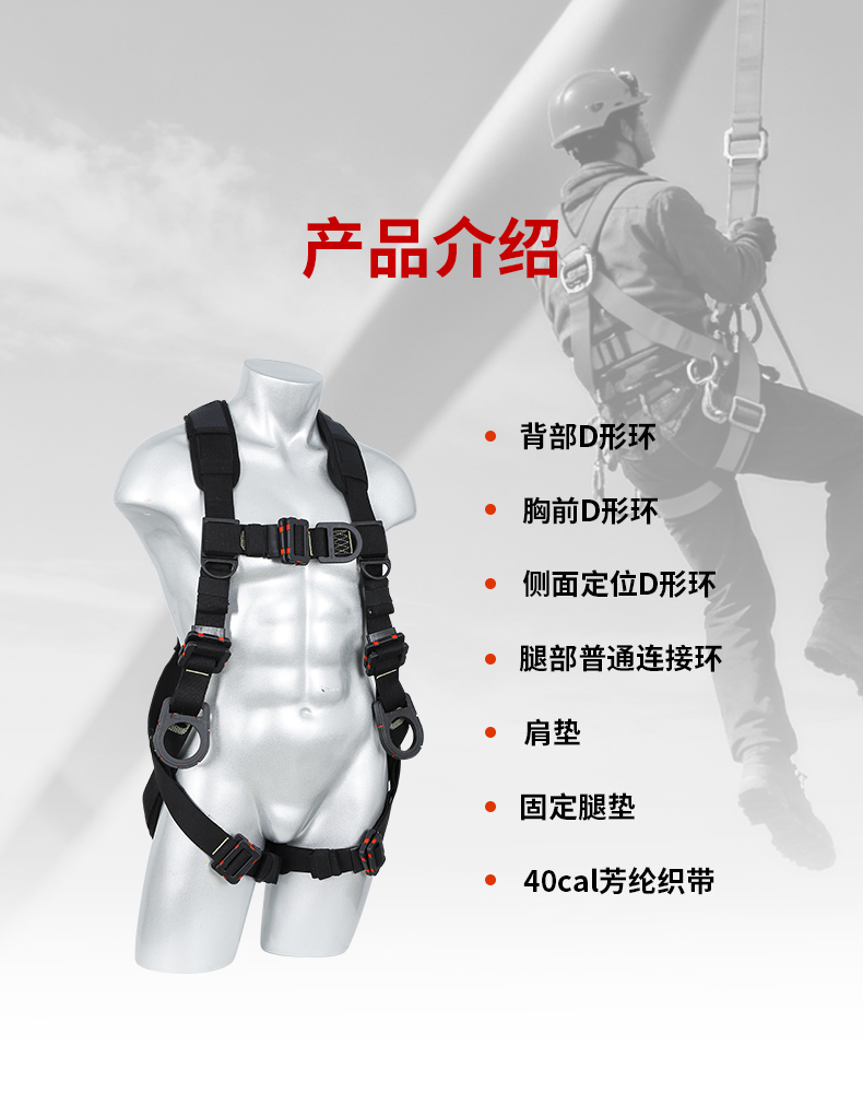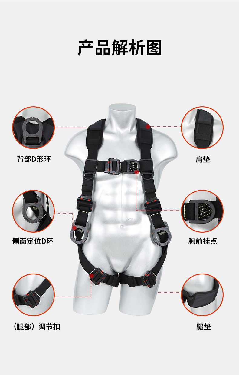 1、4個掛點:后背1個,胸前1個,腰部2個,2、5個調節點:腹,胸,肩3、織帶材質:芳綸+合成纖維4、五金件:合金鋼+絕緣復合層5、調節扣:口日字6、帶護腰7、標準:GB6095-20218、適用:區域限制、