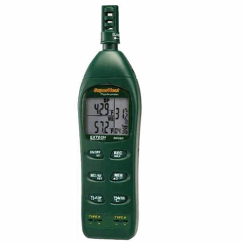 配有兩個過熱環境用K型外部探針輸入和存儲器; 過熱溫差測量:T1-T2、空氣-T1、和T1露點溫度; 背光LCD顯示3個參數:%RH和溫度以及露點溫度、濕球溫度或者K型溫度; RS2